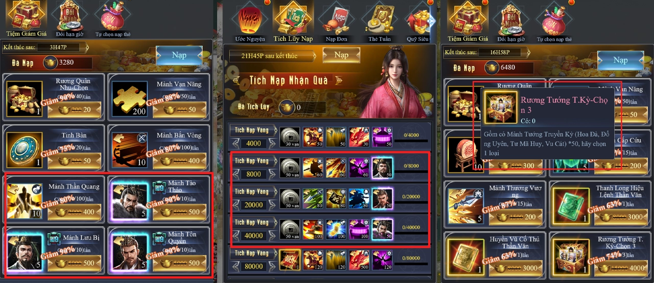 Đôi khi trong SHOP sẽ refresh ra 3 rương tướng Truyền Kỳ tổng 150 mảnh chỉ với 4000 KNB (Hoa Đà, Đổng Uyên, Tư Mã Huy, Vu Cát). Hãy online đều đặn để có cơ hội nhận nhé!