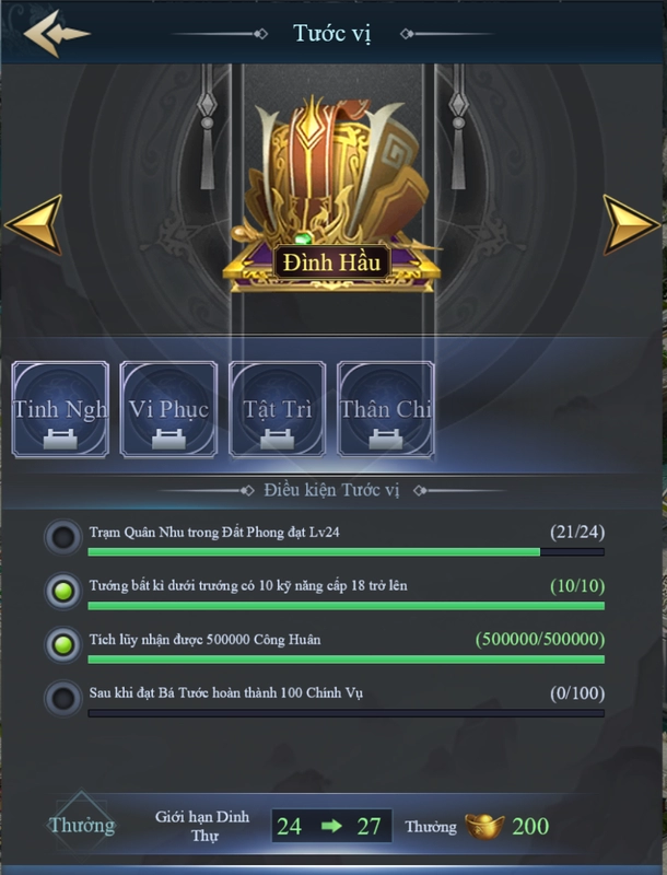 - Mở chức Đình Hầu: dinh thự nâng cấp tối đa lên 27, tướng đạt cấp tối đa 81