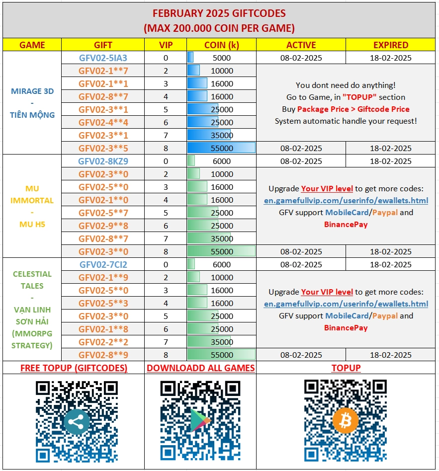 Các mã này từ VIP0 đến VIP8 dành cho nhiều tựa game: