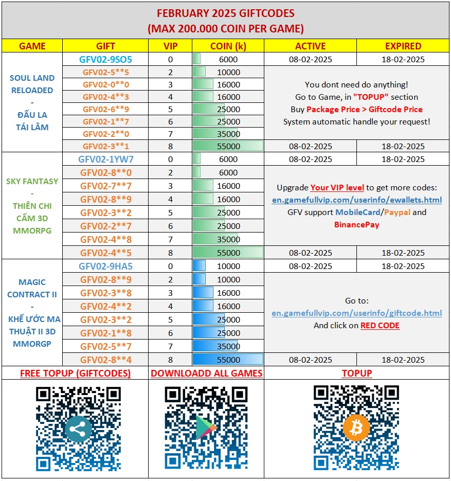 Tháng 11 năm 2024, GameFullVIP gửi tặng bạn rất nhiều code nạp miễn phí cho người chơi (VIP0 tới VIP8)! Bạn sẽ nhận được nhiều hơn nếu nạp tiền và tăng cấp VIP trên trang web.