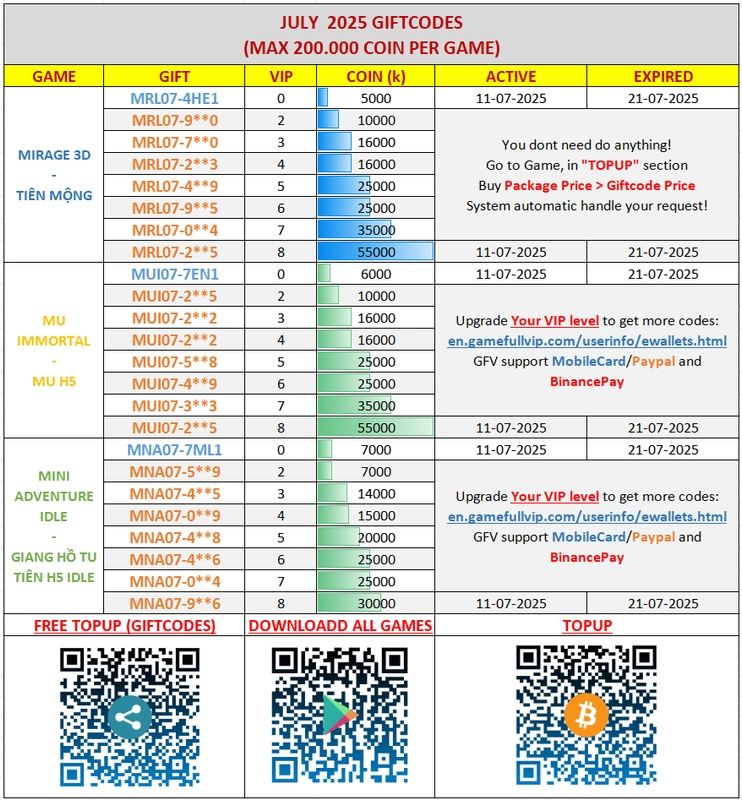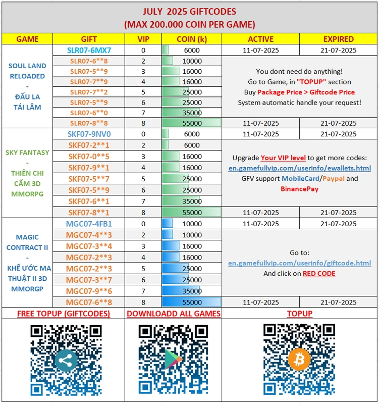 Tháng 07 năm 2025, GameFullVIP gửi tặng bạn rất nhiều code nạp miễn phí cho người chơi (VIP0 tới VIP8)! Bạn sẽ nhận được nhiều hơn nếu nạp tiền và tăng cấp VIP trên trang web.