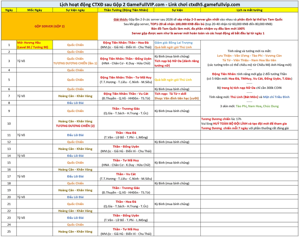 Lịch hoạt động bản Gộp 2 (Update 3.0):